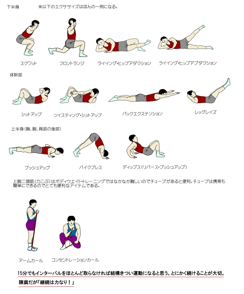 そのような場合、「1日15分で構わないから自宅で身体を動かしてほしい」と言いたい。特別な道具など必要ない。自重トレーニングで十分である。下半身5分、体幹(腹筋、背筋)5分、上半身5分、合計15分である。有酸素運動にはならないので、これで脂肪を減らすことは難しいが、毎日続けていればかなりの筋力低下は防ぐことができるはずである。あとは本人の意識の問題である。80歳になったときの自分を想像してみよう。